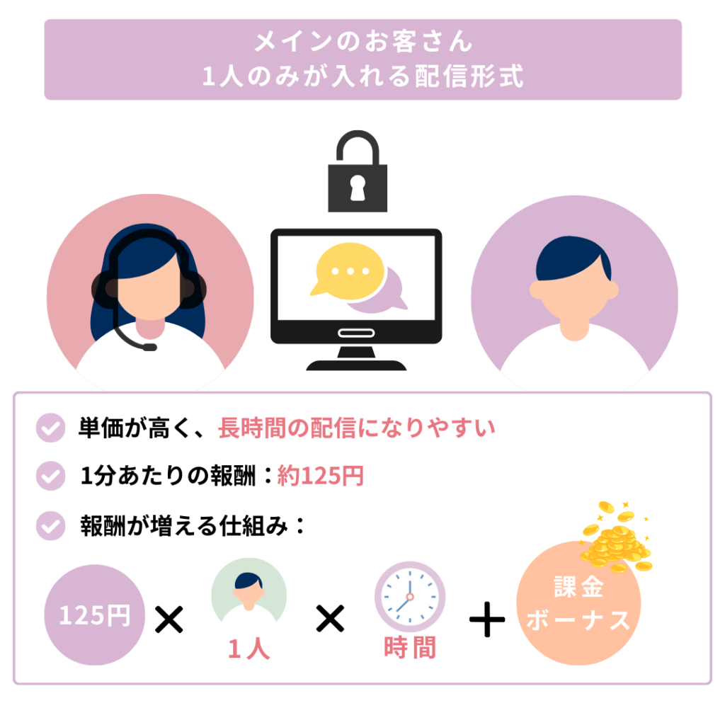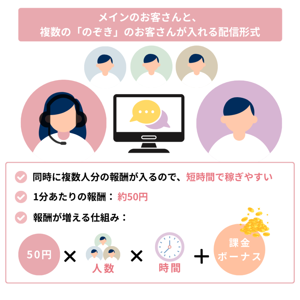そのお客さん一人ひとりが料金を支払っているので、配信の参加人数が増えるほど報酬も大きく伸びていくのが特徴です。
